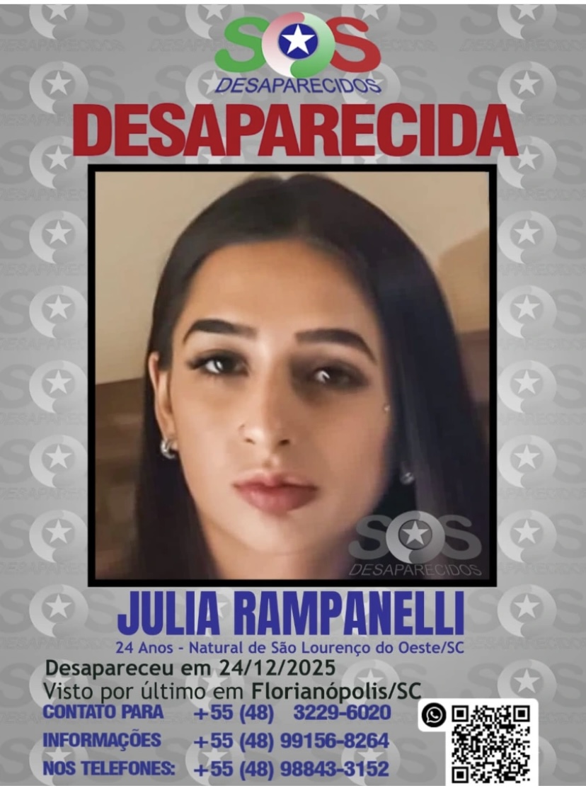 A jovem Júlia Rampanelli, de 24 anos, que reside em Florianópolis está desaparecida. A última vez que a jovem foi vista foi na tarde do dia 24 de dezembro, quando deixou a capital catarinense com destino a Itapema, no Litoral Norte do estado, onde pretendia encontrar um rapaz.